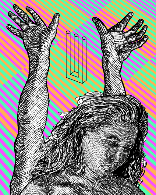 Acceptance/Disgust centers around an impossible figure of the woman looking down in defeat, while also raising her hands in Orant (surrending to the powers that be). If you take a closer look, you'll notice that the woman's shoulders and arms are down and that the arms that you can see aren't actually her's - the lighting is coming from the opposite direction and they're actually a male's arms, but they still would occupy the same space, if, somehow, this scene was possible.