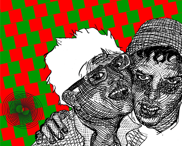 Thus, I chose to show a couple in a sort of embrace - both having similarities, yet both performing different roles within the relationship. The background is of the famous, Café Wall illusion pattern, where the parallel lines attempt to go top diagonals against themselves. The color scheme fights for your attention - as perhaps each figure may.