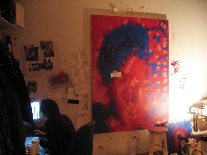 A little less than halfway through. Late. The small pieces of tape on the walls were used to mark the areas that needed a screenprint on them; the white piece of paper attached to the painting holds the coordinants to the next color. You can see the original photograph and my color ideas to the right of the painting - as well as one of the smaller paintings in this series, below and to the right.